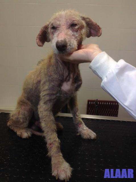 O diagnóstico inicial foi muito reservado, dado o estado que apresentava toda a pele do corpo. Foram feitos testes iniciais e confirmada sarna muita severa. Imediatamente começou com banhos, cremes e medicação. Uns dias depois, o diagnóstico tão esperado: NEGATIVO para leishmaniose, o nosso maior receio. Presença de infeções várias por fungos e bactérias. Comeu sempre muito bem e só quis dormir na primeira semana.